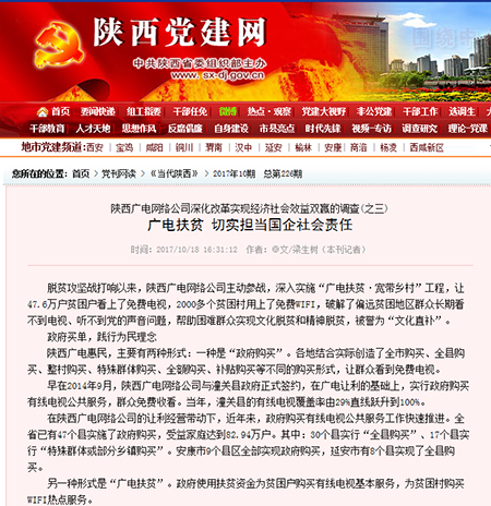 | 《当代陕西》作了题为《广电扶贫切实担当国企社会责任》专题报道 |