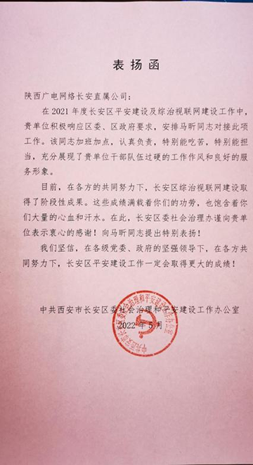 5月16日,中共西安市长安区委社会治理和平安建设工作办公室向长安直属公司发来表扬函,对长安直属公司集团业务部员工马昕提出表扬。