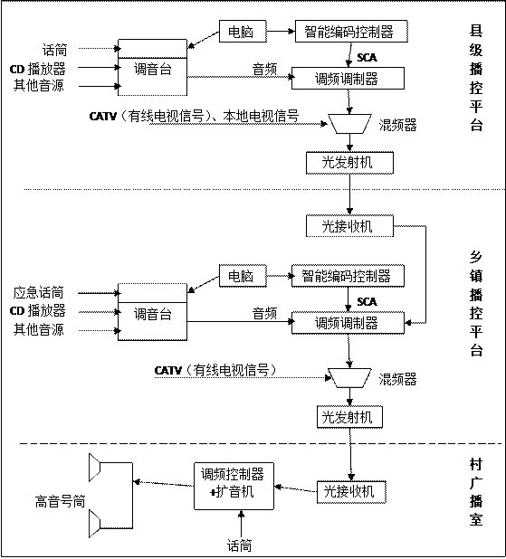 (3)县到乡镇到村有线应急广播:县政府设县级播音室,县政府辖区内未布置乡镇到村应急有线广播的乡镇在行政村、自然村设扩音器,高音喇叭覆盖行政村、自然村;已布置乡镇到村应急有线广播的乡镇,县级广播内容由乡镇播音室转播。