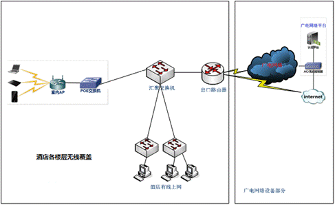 目前部分酒店采用普通家用桌面型无线路由器实现无线覆盖,但存在很多问题,(1)接入网线暴露在外,摆放不好规范影响美观;(2)无法实现集中管控,无法快速判断和处理设备故障,导致用户投诉增多;(3)没有认证系统,无法实现溯源功能,按照国家82号文件的要求由酒店承担法律责任;(4)没有认证系统,无法通过微信、官网等手段收集客户信息,丢失了定向营销的良好机会,给酒店带来了损失。