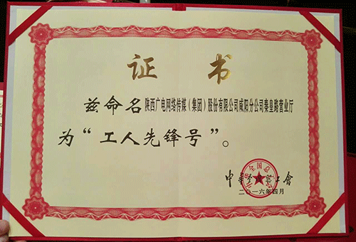 4月29日,在陕西宾馆召开的2016年陕西省庆祝五一国际劳动节暨表彰大会上,陕西广电网络传媒(集团)股份有限公司咸阳分公司秦皇路营业厅被中华全国总工会授予“工人先锋号”荣誉称号。