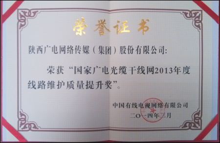 2013年,公司上下齐心、共同努力,在国家光缆干线维护工作中取得了优异的成果,国干各项运行指标较2012年均有较大幅度提升,达到了总局要求标准。2013年,省公司荣获“国家广电光缆干线网2013年度线路维护质量提升奖”;汉中分公司荣获“国家广电光缆干线网2013年度先进中继站奖”;省公司刘伟、渭南分公司郭永忠、宝鸡传媒公司岳宝峰荣获“国家广电光缆干线网2013年度先进维护个人奖”。