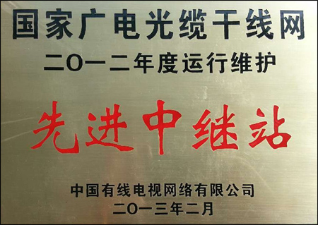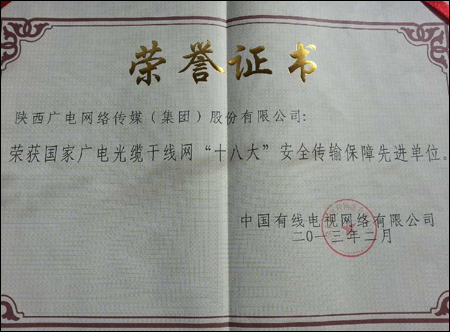 在2012年度国干网维护工作中,公司线路、机房可用率达到电信运营商级别的99.99%标准以上,荣获“国家广电光缆干线网十八大安全传输保障先进单位”称号;咸阳分公司获得“国家广电光缆干线网2012年度先进中继站;李瑞鹏等三名员工分别获得“国家广电光缆干线网2011年度线路维护先进个人”称号。