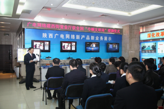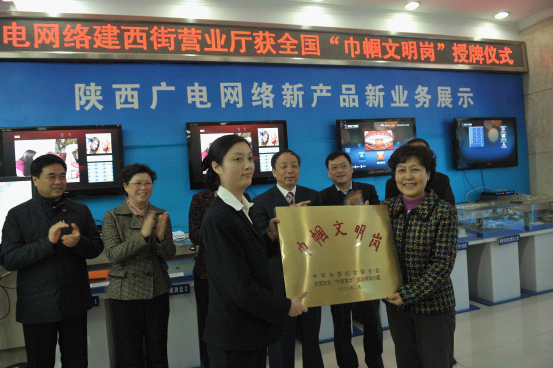 陕西广电网络传媒(集团)股份有限公司西安分公司建西街营业厅早在2008年10月便被陕西省妇联授予“巾帼文明岗”荣誉称号,在去年的全国“巾帼文明岗”评比中,建西街营业厅从数百参评单位中脱颖而出,被全国妇联授予“巾帼文明岗”荣誉称号。
