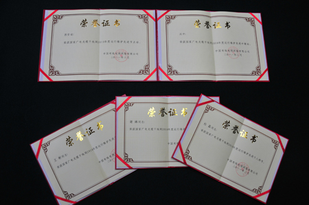 省公司中心机房(西安站)和汉中分公司中心机房(汉中站)分别荣获“国家广电光缆干线网2010年度运行维护先进节点站”和“先进中继站”;西安分公司运维部杜磊、省公司运调部王彬和谢琳三人分别荣获“国家广电光缆干线网2010年度运行维护先进个人”称号。