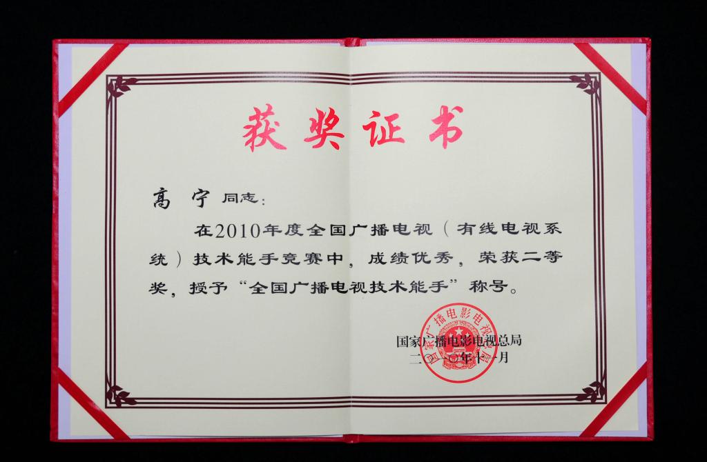 11月1日至4日,2010年全国广播电视技术能手竞赛在北京举行,来自全国广电系统的140多名选手同场竞技。经过理论笔试、技能操作两个环节的严格考核,陕西广电网络公司运行调度部高宁同志荣获二等奖,被国家广电总局授予2010年全国广播电视技术能手称号。