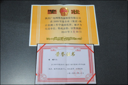 近日,从国家统计局西安调查队传来喜讯,陕西广电网络传媒股份有限公司荣获2009年度西安市统计监测工作先进单位,同时,公司经营投资部陈娟获得2009年度西安市统计监测工作先进个人称号。
