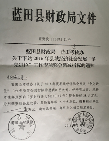 日前,蓝田县财政局、考核办下达了《县域经济社会发展“争先进位”工作专向奖金调减指标的通知》。通知中表彰了蓝田支公司对县域经济所做出的贡献,并调整奖励资金壹万元整,作为蓝田支公司发展业务使用。