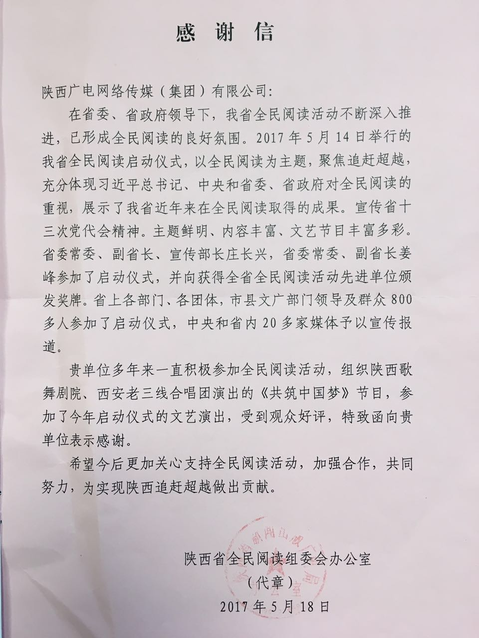 5月18日,陕西省全民阅读组委会办公室向公司发来感谢信,对陕西广电网络多年来的积极参与,表示感谢。