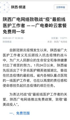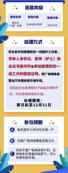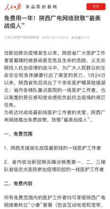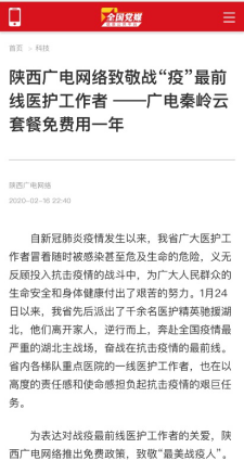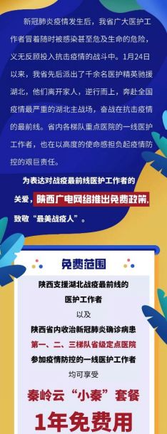 为表达对战“疫”最前线医护工作者的关爱,2月16日,陕西广电网络推出免费活动,致敬“最美战疫人”。这是继春节期间有线电视免费看、停课不停学免费导学之后,陕西广电网络推出的又一项关爱政策。