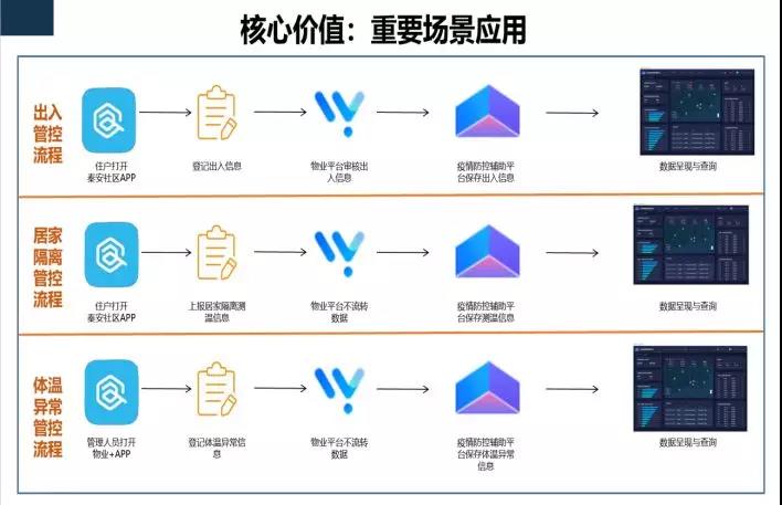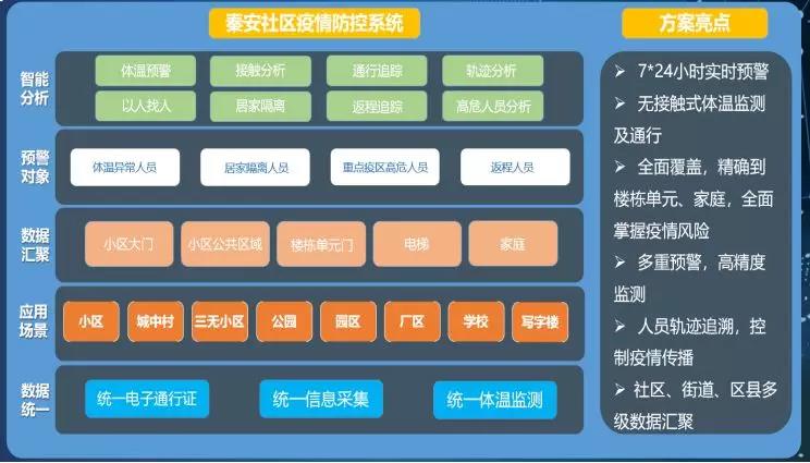 “社区疫情防控系统”由“五道防线(小区门禁、小区公共区域、单元门、电梯、家庭)+三大平台”(APP平台+智慧物业平台+社区疫情防控平台)组成;7x24小时实时预警,无接触式体温监测,精确到楼栋单元、家庭,全面监控疫情风险,多重预警,高精度监测人员轨迹追溯,控制疫情传播,社区、街道、区县多级数据汇聚,提供居民、物业、街道(防疫办)、政法(公安)等多个部门数据互联互通,主要围绕疫情防控的“早发现,早报告,早隔离,早治疗”核心诉求,在切断一切住户与病毒接触的渠道的同时,对小区公共区域及居家环境进行监测,第一时间研判疫情状态,线上上报疫情数据,扼制传播扩散风险,监测疫情态势,最大化保障一线防控人员安全,避免交叉感染;在城市疫情防控管理中,外防输入、内防扩散;疫情后,能够提升社区智能化水平,为居民提供精准便捷的生活服务。