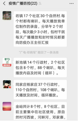 此外,支公司还组建了疫情防控办公群,要求每天各片区负责人将各镇(办)、村部播放情况录制视频在群内进行汇报,及时督促,及时广播,确保249个村1016个大喇叭发挥疫情应急宣传的作用。截止目前,支公司通过应急广播系统播放各类通告通知信息54条。