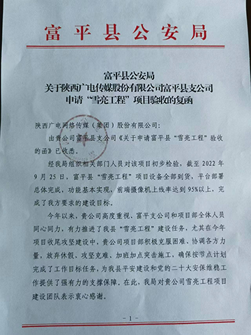近日,公司承建的富平、大荔、澄城三个“雪亮工程”项目全面完工交付并通过验收。当地公安局发来的表扬信,对公司在“雪亮工程”项目建设中不畏艰难、顽强拼搏、攻坚克难的精神以及能打硬仗的专业水平表示肯定。