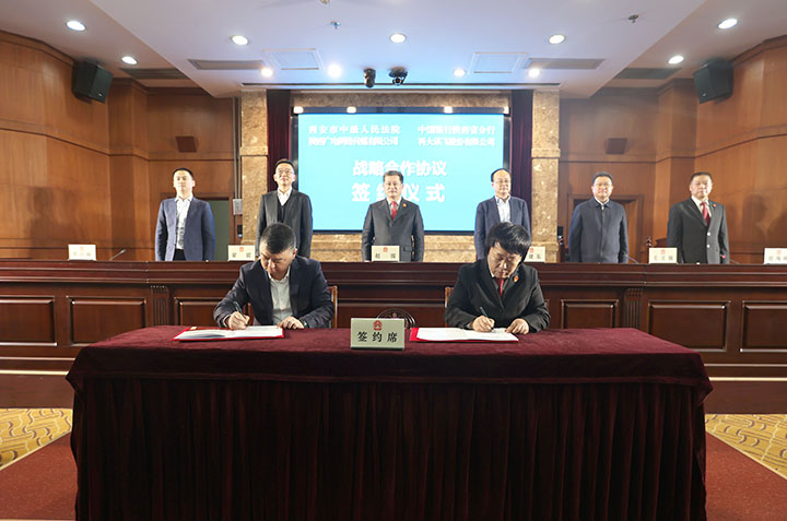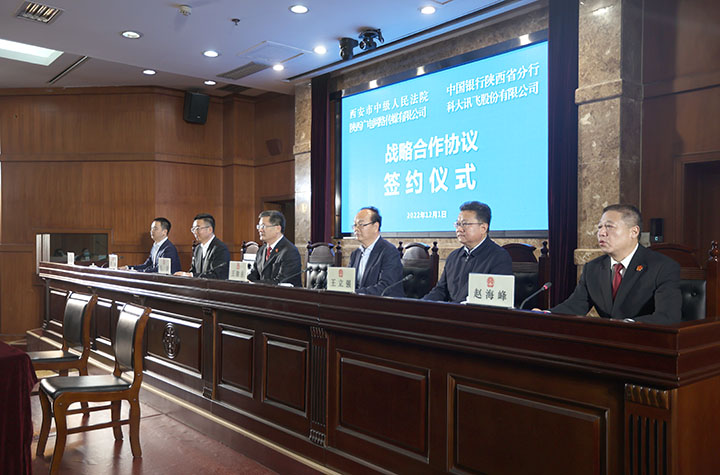 12月1日,西安市中级人民法院与中国银行陕西省分行,陕西广电网络传媒(集团)股份有限公司、科大讯飞股份有限公司签约智慧法院建设战略合作协议。西安市中级人民法院党组书记、院长赵雷,西安市政府党组成员、秘书长王建东,陕西广电网络党委书记、董事长王立强,中国银行陕西省分行党委书记、行长蒙震,科大讯飞股份有限公司副总裁周佳峰出席签约仪式并致辞。西安市中级人民法院审委会专委张曼慧、中国银行陕西省分行党委副书记田晓、陕西广电网络党委副书记、副董事长、总经理韩普以及科大讯飞股份有限公司丝路总部副总经理彭梦明分别代表各方签署战略合作协议。