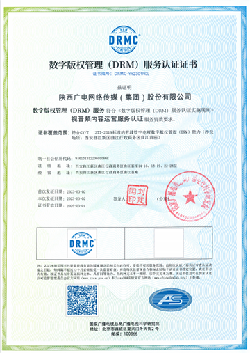 近期,陕西广电网络获得了广电总局广播科学研究院颁发的“数字版权管理(DRM)服务认证”认证证书,取得“视音频内容运营服务认证”资质。