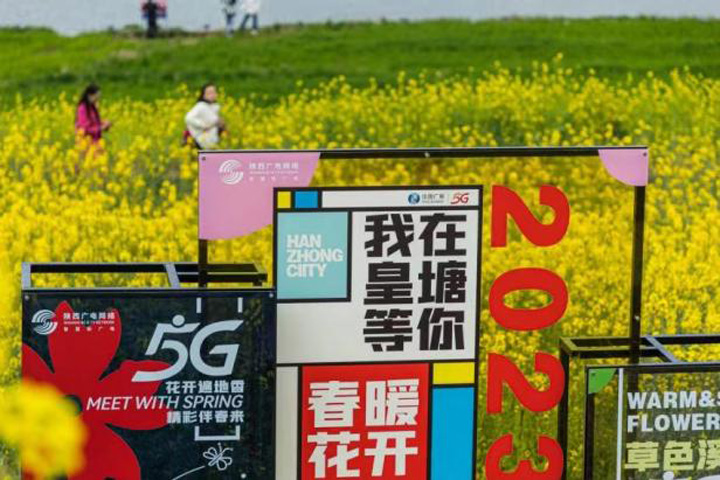 活动现场,陕西广电网络5G宣传与油菜花海完美融合,吸引游客争相打卡拍照。