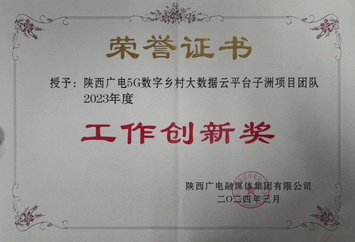 近日,公司5G数字乡村大数据云平台子洲项目团队获评陕西广电融媒体集团2023年度工作创新奖。