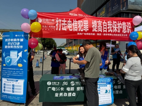 安康分公司市县两级工作人员向过往市民发放“三电”设施安全保护宣传资料,普及保护“三电”设施相关法律法规,向群众讲解防范电信网络诈骗知识,在进一步增强了群众对“三电”设施保护意识的同时提升群众对广电5G品牌的知晓率。