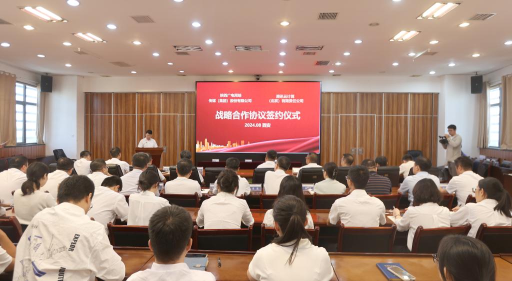 陕西广电网络传媒(集团)股份有限公司党委书记、董事长、总经理韩普及公司班子成员,相关部门负责人,腾讯云副总裁闫鹏、传媒行业销售总监赵大兴等出席签约仪式。陕西广电网络公司融媒体事业部总经理段炼、腾讯云传媒行业销售总监赵大兴分别代表双方签约。