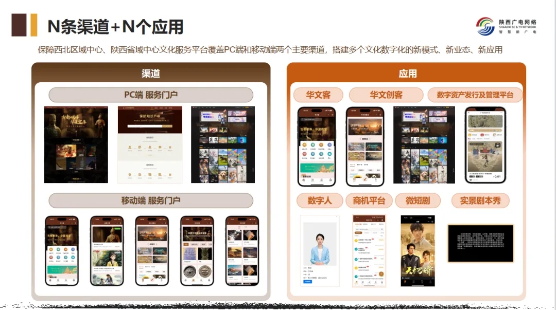 陕西广电网络围绕国家文化数字化战略实施和文化大数据体系建设,以“国家文化大数据西北区域中心和陕西省域中心”建设为契机,积极落实智慧广电公共服务+发展方向,通过项目建设加强了文化资源数字化供给,培育了新型文化数字化消费新场景和新业态。陕西广电网络以文化大数据体系“一网、一库、一平台、三中心”为核心建设任务,创新性地提出了陕西文化大数据“113N”服务体系规划,聚焦文化资源聚合和平台能力建设,服务我省及西北区域公共文化服务能力提升。通过文化新质生产力打造,促进文化产业发展,形成了文化数字化战略创新落地的“陕西模式”。