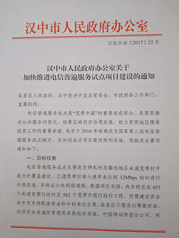 近日,汉中市人民政府办公室下发《关于加快推进电信普遍服务试点项目建设的通知》,加快推进汉中市电信普遍服务试点项目建设。