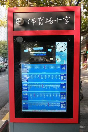 目前,智慧公交电子站台亮相咸阳街头,新站牌不但有时间提示,还有天气预报,以及实时温度显示,PM2.5数据显示。不仅如此,在站牌上,能够清晰的看到下辆车距离还有多远,还有几站能够到达,这辆车后面还有几辆车,分别在什么位置。针对老年人眼睛不好可能看不清上面的文字,新站牌还配有人工语音报站系统,会进行报站。据了解,咸阳市已实施完成公交电子站台项目(一、二期)建设点位共计38个。