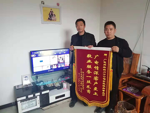 近日,铜川市新区坡头镇冯兰村用户兰卫红夫妇把两面写有“广电情深客户至上敬业服务一丝不苟”、“技术精湛好服务民生工程谢党恩”的锦旗送到了铜川分公司工程技术部和光网改造项目施工人员杨腾腾手中,衷心感谢铜川分公司的快速反应和优质服务。