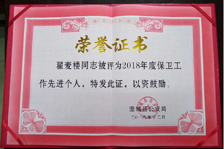 12月26日,澄城县公安局对2018年经济文化保卫工作中做出成绩的的先进集体和先进个人予以表彰,澄城支公司翟麦楼同志荣获“保卫工作先进个人”。
