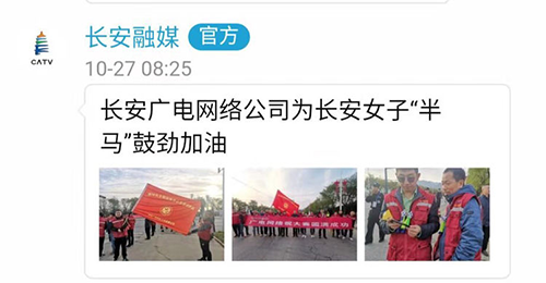 10月27日,“2019长安国际女子半程马拉松暨全国女子半程马拉松锦标赛”盛大开跑。长安直属公司50余名员工组成了庞大的“广电红马甲助威团”,带着毛巾、退热贴、饮用水等助赛用品,手拉“秦岭云”祝赛横幅,高举“新时代文明实践中心志愿者服务队”旗帜在场边为比赛选手加油鼓劲。大家的激情和热情深深地感染着赛道上的选手也充分展现了广电人的积极风貌和良好形象。
