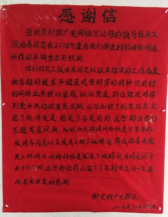 景村营业部网格管辖5个村,服务用户1300多户。网格经理张培养十年如一日,以过硬的技术、热情周到服务网格用户,获得了用户的信任和称赞。