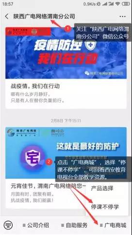 疫情防控关键时期,渭南分公司及时创新服务形式,不断升级服务质量,在分公司微信公众号首页自定义菜单中添加了“停课不停学”二级子菜单,使广大学子可以方便快捷的观看西安教育电视台的教学视频资源,受到用户的广泛好评。