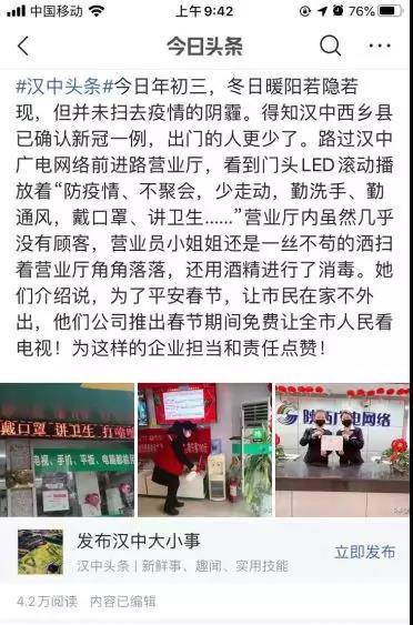 疫情期间,汉中分公司营业厅坚持“春节我在岗 服务不打烊”的服务宗旨,坚守岗位,用行动诠释着责任与担当。汉中分公司营业厅坚持每天按时开门营业,做好群众防疫知识宣传,厅内厅外消毒和防护,给用户创造洁净的环境。除了在厅内值守,营业员们还积极通过微信群、朋友圈等线上渠道宣传公司的微信营业厅、电视营业厅、网上营业厅、支付宝等,引导客户无接触自助服务。20多天以来,广电网络汉中分公司营业厅始终“坚守”,温暖着整个城市。这种坚守和逆行,受到了市民的点赞和好评。