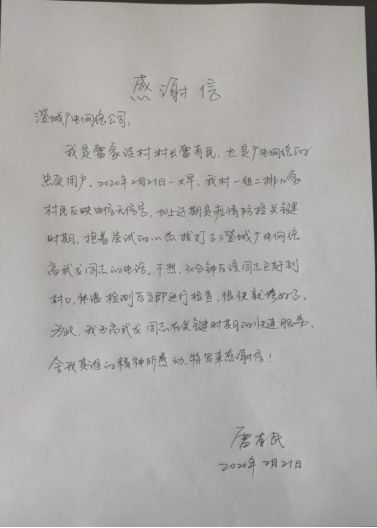 2月21日下午,澄城支公司收到了雷家洼村村长雷有民的感谢信,对支公司网格经理高武龙高效服务、特殊时期的敬业精神表示充分肯定和赞扬。