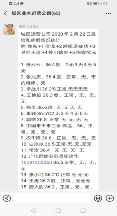 一是全员重视,快速落实。及时将工作要求和疫情防控知识宣传到每位员工,制定了疫情防控工作方案,明确了内容任务和责任。二是彻底排查员工出行情况和人员接触史,要求全员每天通过微信如实汇报各自身体状况和出行情况,由专人统计上报,严格执行“日报告、零报告”制度。三是加强疫情防控物资保障,为坚守一线的工作人员做好口罩、消毒液、酒精、手套等保障工作,每天对营业厅、办公场所坚持消毒,人员到访必须测温登记。四是组织员工积极参加社区抗疫防控志愿者活动,在指定小区认真排查登记、严格门卫值守、体温测量,为打赢疫情防控攻坚战贡献力量。