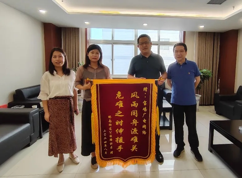 8月 22 日,宝鸡传媒公司收到宝鸡市渭滨区桥南街道公园路社区赠送的写着“风雨同舟渡难关 危难之时伸援手”的锦旗。社区负责人代表全体居民向广电网络公司表达了最诚挚的谢意,高度赞扬了公司在关键时刻展现出的社会责任感。