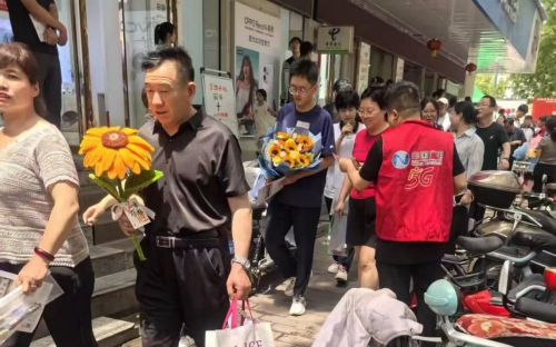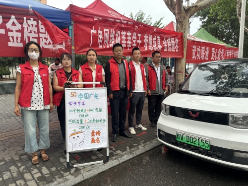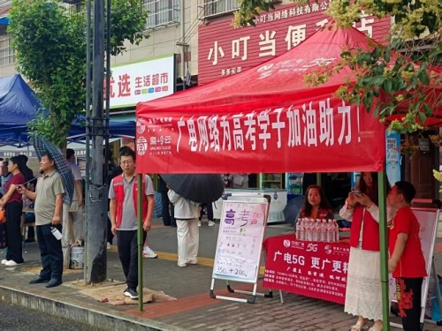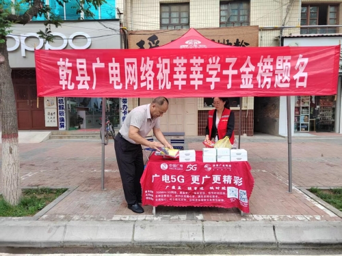 乾县支公司在乾县二中考点设置“助力高考”志愿服务站,为考生及家长提供休息区、矿泉水、夏凉扇等,并积极宣传广电5G业务与“十心服务”。