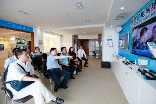 在刘进总经理的陪同下,何煜董事长参观了公司业务演示厅,观看了高清互动电视及家庭智能终端等业务演示。