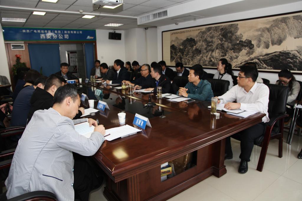 4月4日,陕西广播电视集团总经理刘兵、副总经理李雪一行到西安分公司调研,深入了解公司运营管理情况,调研陕西广电网络转型发展的具体举措,并与陕西广电网络总经理王立强、西安分公司总经理白文利、党委书记田耀武等进行座谈。