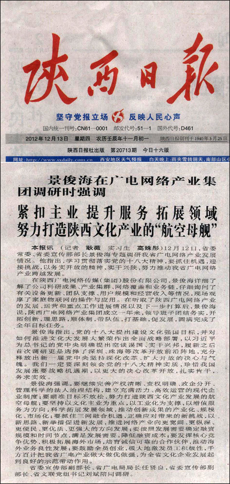 景俊海在广电网络产业集团调研时强调 紧扣主业 提升服务 拓展领域 努力打造陕西文化产业的“航空母舰”