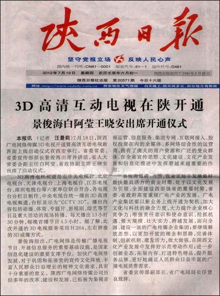 3D高清互动电视在陕开通 景俊海白阿莹王晓安出席开通仪式