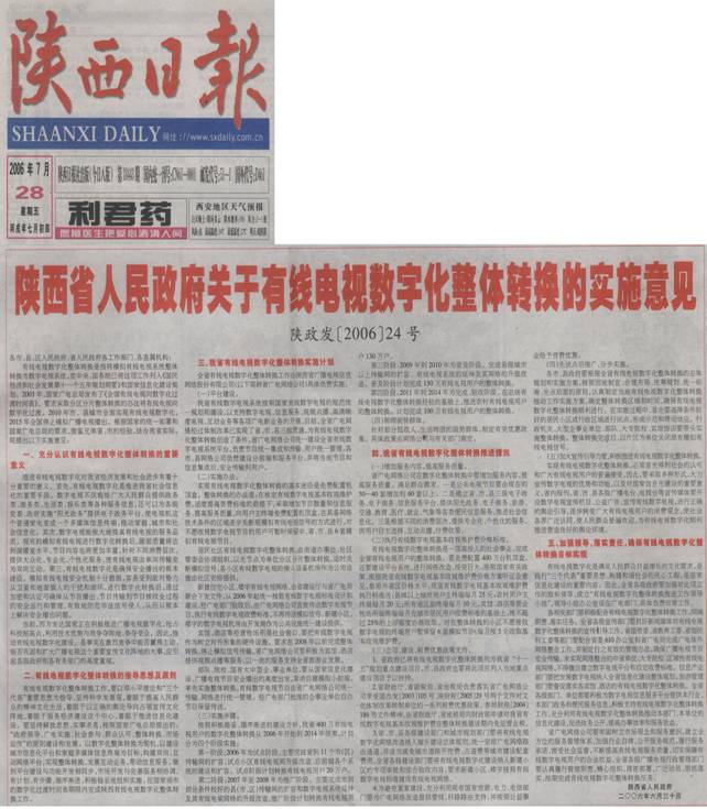 2006年12月15日《陕西日报》“省政府有线电视数字化整体转换实施意见”
