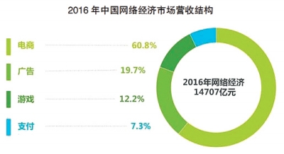 《报告》称,2016年,中国网络经济营收规模达到14707亿元,同比增长28.5%。经过多年高速增长后,网络经济发展进入稳健期,增速略有放缓,但整体仍保持稳定的增长态势,未来还将继续增长。