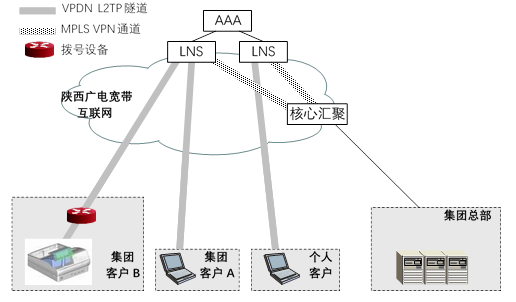 强扩展性:构建于陕西广电数据骨干网上的虚拟专用拨号网(VPDN)可以多个并存、相互独立、互不影响,并且每个客户均可根据自己的实际需求开通一个或多个VPDN业务,具有很强的扩展能力。
