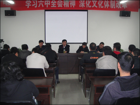 杨继泽书记从十七届六中全会召开的背景、重要性,从物质文化、制度文化、行为文化、精神文化四个方面进行了分析,详细解读了六中全会精神,要求分公司全体党员干部认真学习、深刻领会六中全会精神,结合分公司经营工作和业务发展展开学习讨论,要“一抓人心、二抓发展”,同时要求分公司相关部门加强干部员工的培训,有计划地培养一批“三网融合”复合型人才,推动分公司跨越式大发展,推动地方文化产业大繁荣。