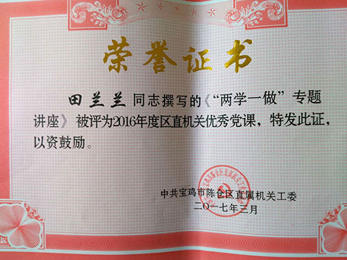 为深入推动基层党组织开展“两学一做”学习教育,进一步发挥党课在党员日常教育管理中的作用,鼓励基层党组织结合实际创新党课方式,让党课更加贴近党员工作生活实际,更具吸引力和针对性,2016年陈仓区直属机关工委在全区基础党组织当中开展了“两学一做”党课征集评选活动。在此次评选活动中,陈仓直属公司党支部书记田兰兰同志撰写《“两学一做”专题讲座》课件被评为全区优秀党课。
