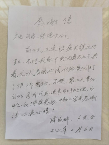2月2日,在疫情防控形势严峻的情况下,卜老先生家线路出现了故障,抱着试试看的心情打了服务电话,经过耐心沟通,第二天一早,马丹便赶来了,并快速将故障处理好,让卜老先生感动不已,向公司送来感谢信。